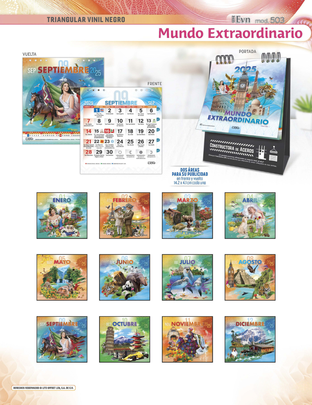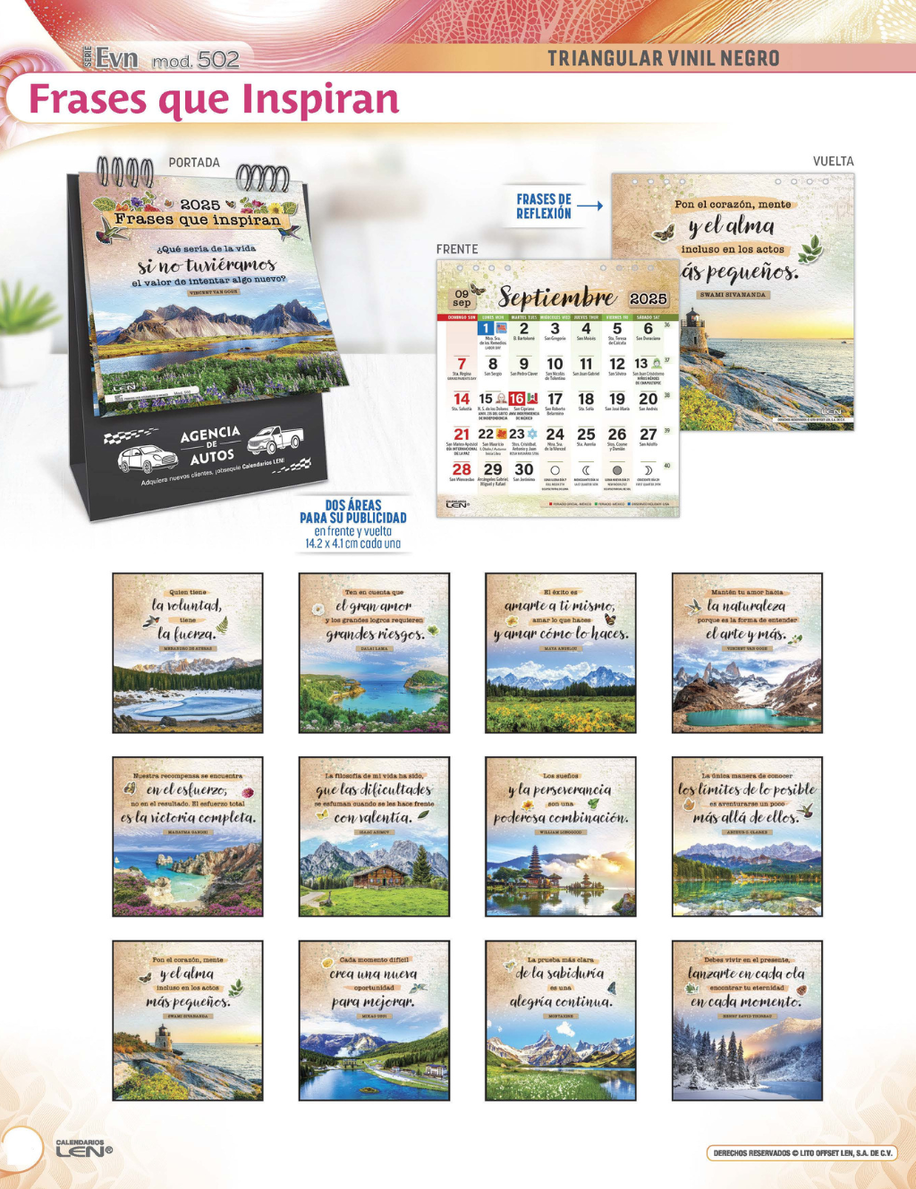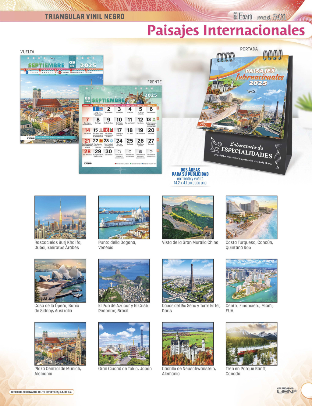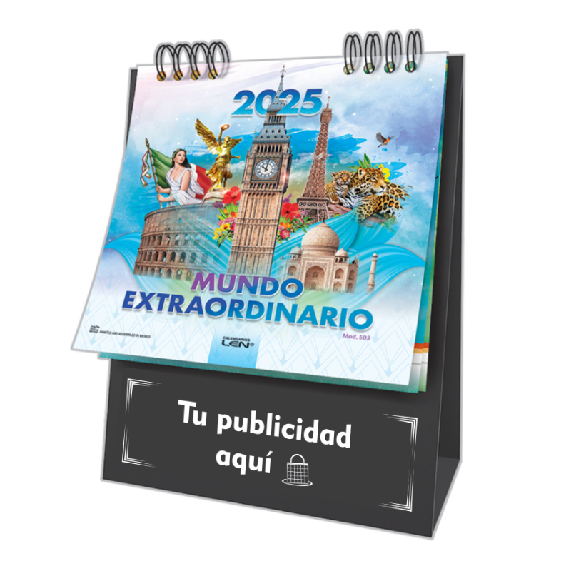 Calendario de escritorio con 13 hojas impresas a todo color (frente y vuelta), base reforzada de vinil negro, barniz decorativo de alto brillo y espiral metálico.
