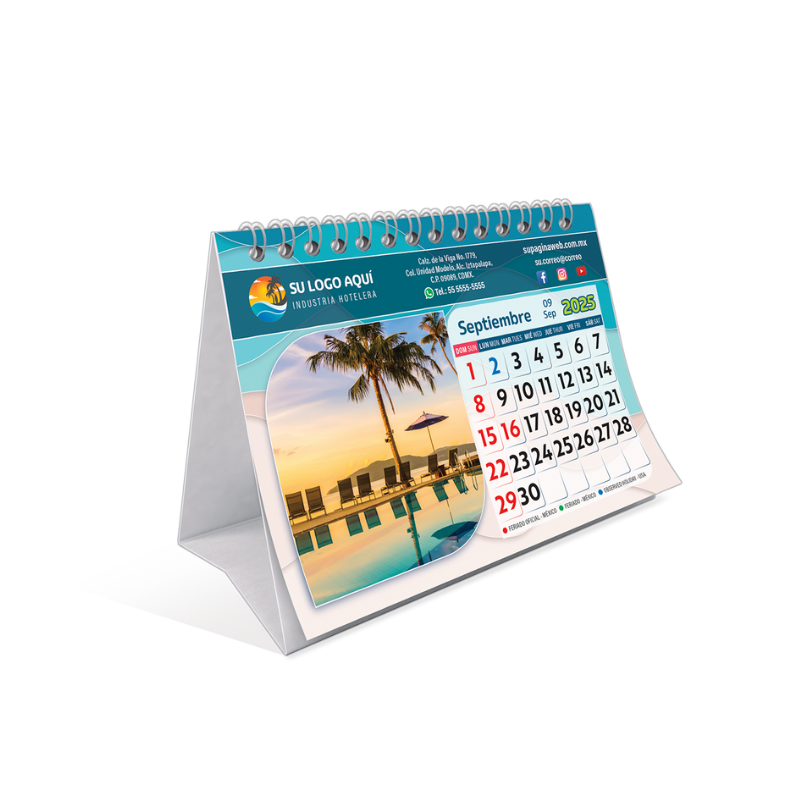 Calendario de escritorio con diseño 100% personalizado, con 8 hojas impresas a todo color (frente y vuelta), base reforzada de cartulina y armado con arillos metálicos.