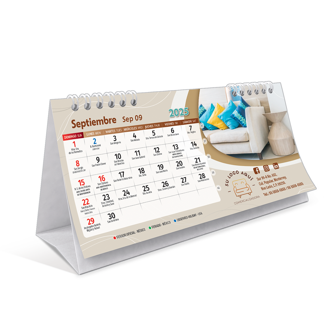 Calendario de escritorio con diseño 100% personalizado, con 13 hojas impresas a todo color (frente y vuelta), base reforzada de cartulina y armado con arillos metálicos.