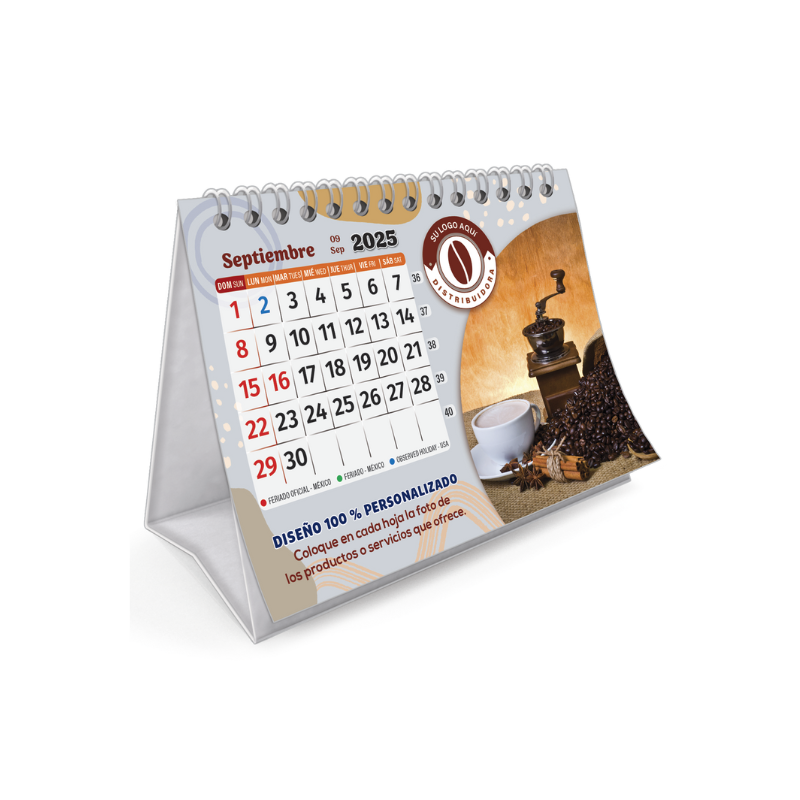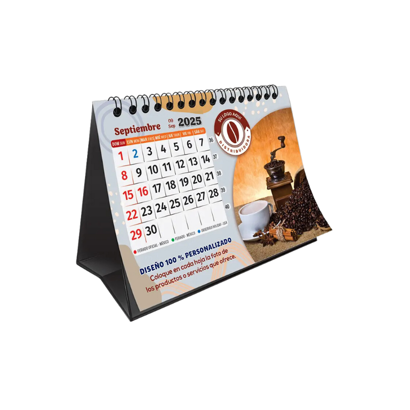 Calendario de escritorio con diseño 100% personalizado, con diseño 100% personalizado, con 8 hojas impresas a todo color (frente y vuelta), base reforzada de vinil y armado con arillos metálicos.