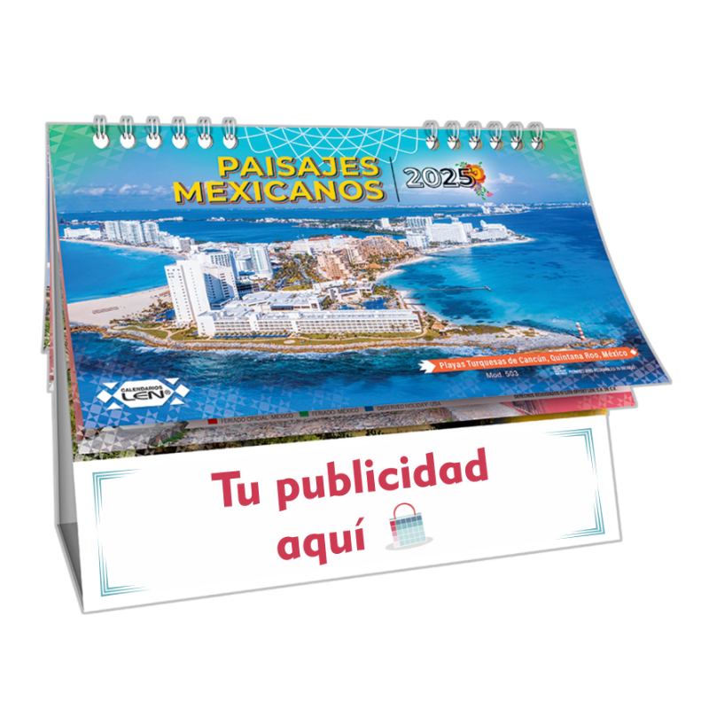 Calendario de escritorio con 13 hojas impresas a todo color (frente y vuelta), barniz decorativo de alto brillo, base reforzada de vinil blanco y armado con arillos metálicos.