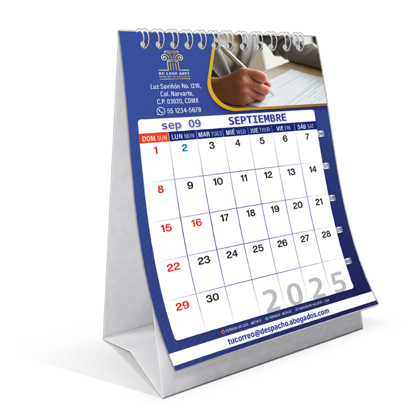 Calendario de escritorio con diseño 100% personalizado, con 13 hojas impresas a todo color (frente y vuelta), base cartulina blanca y armado con arillos metálicos.