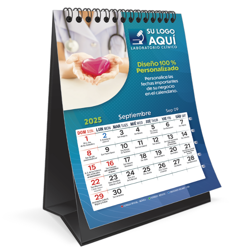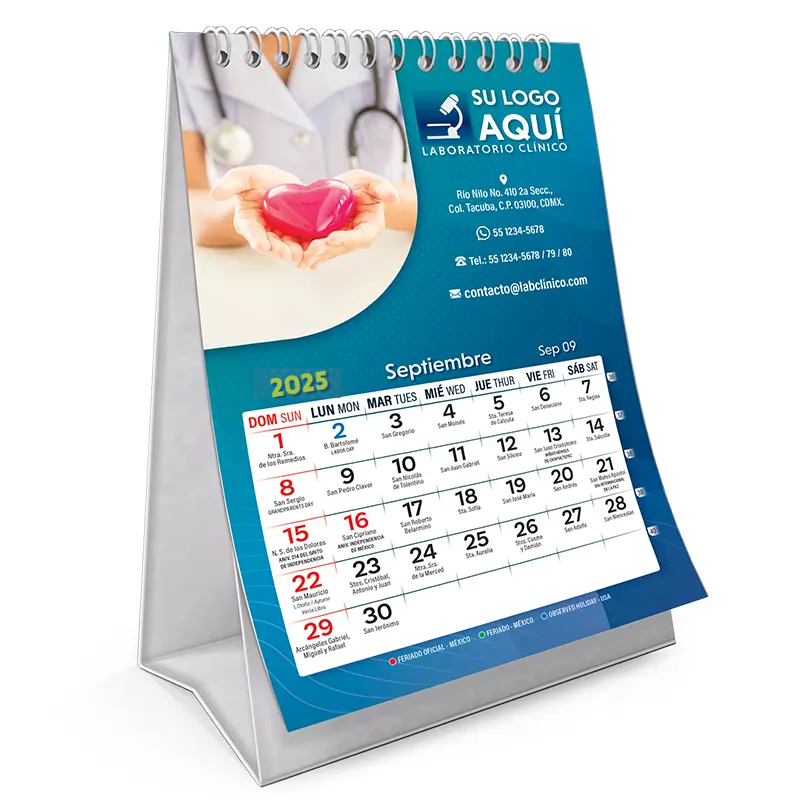 Calendario de escritorio con diseño 100% personalizado, con 13 hojas impresas a todo color (frente y vuelta), base reforzada de vinil y armado con arillos metálicos.