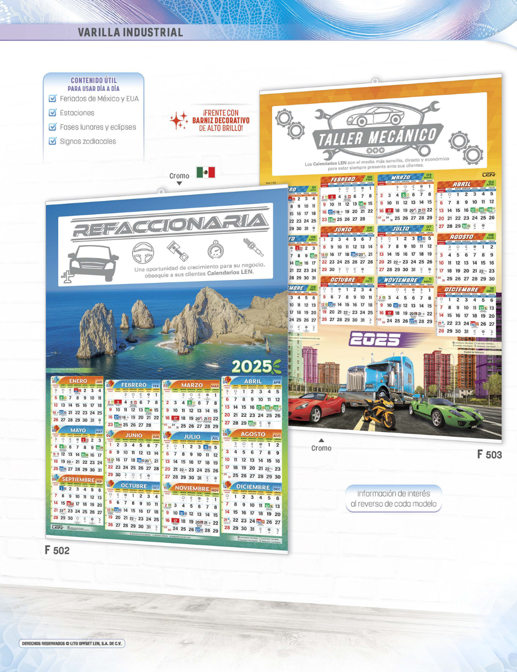 Calendario de pared impreso a todo color (frente y vuelta), barniz decorativo de alto brillo, con doble varilla metálica y ojillo para colgar.