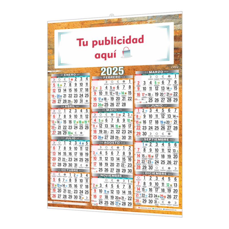 Calendario de pared impreso a todo color (frente y vuelta), barniz decorativo de alto brillo, con doble varilla metálica y ojillo para colgar.