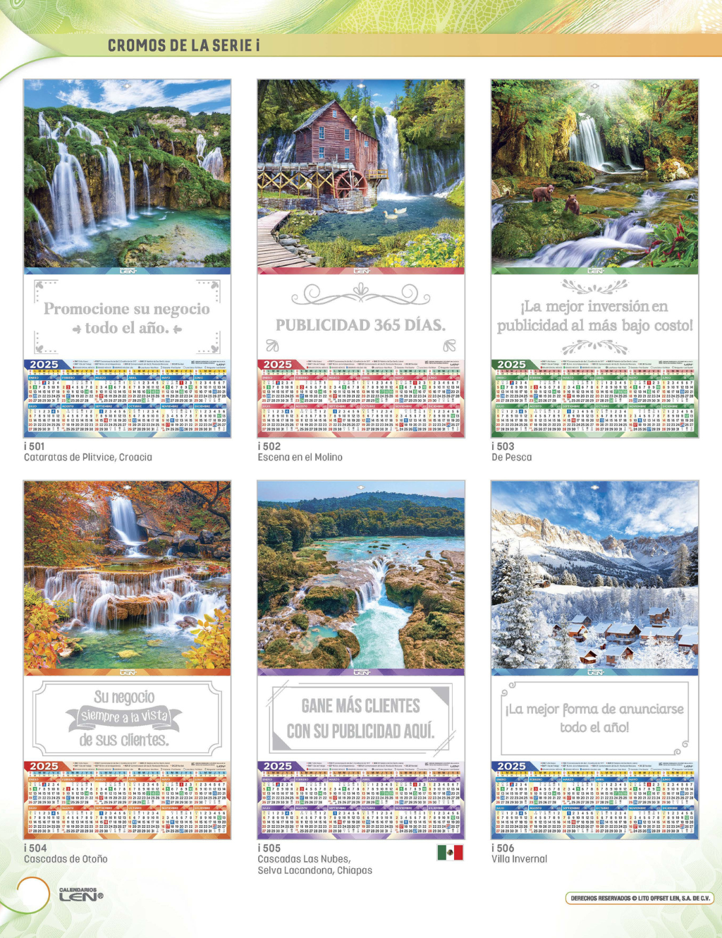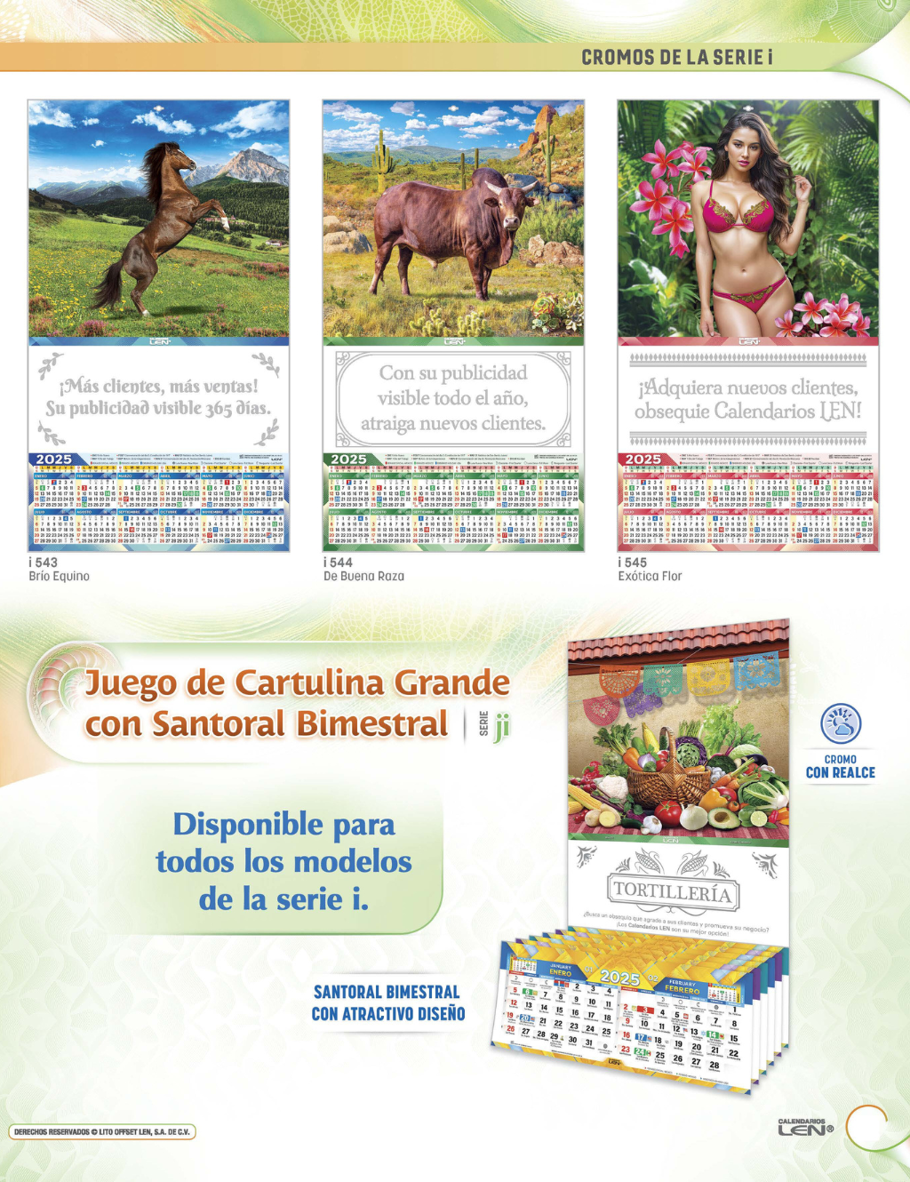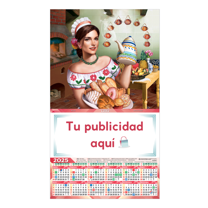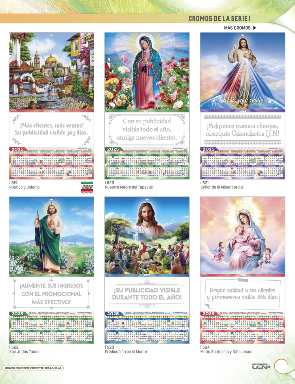 Calendario en cartulina, impreso a todo color, barniz de alto brillo, cromo con realce y ojillo para colgar.