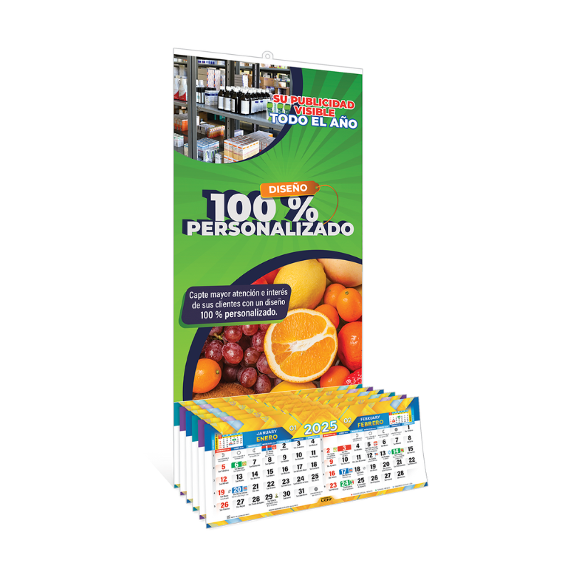 Calendario de pared con diseño 100% personalizado, impreso a todo color en papel satinado, santoral de 6 hojas y varilla con ojillo para colgar.