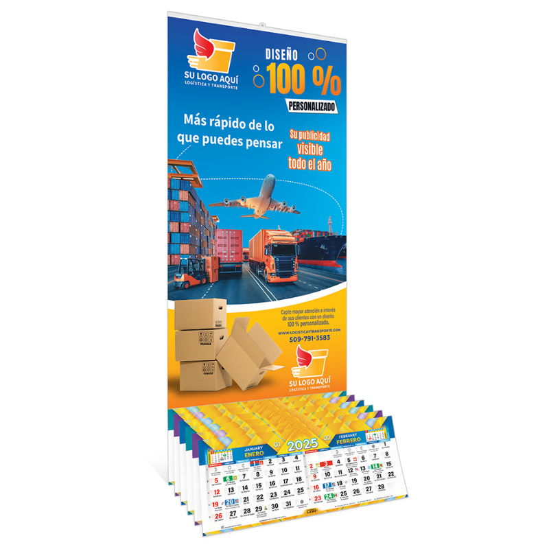 Calendario de pared con diseño 100% personalizado, impreso a todo color en papel satinado, santoral de 6 hojas y varilla con ojillo para colgar.