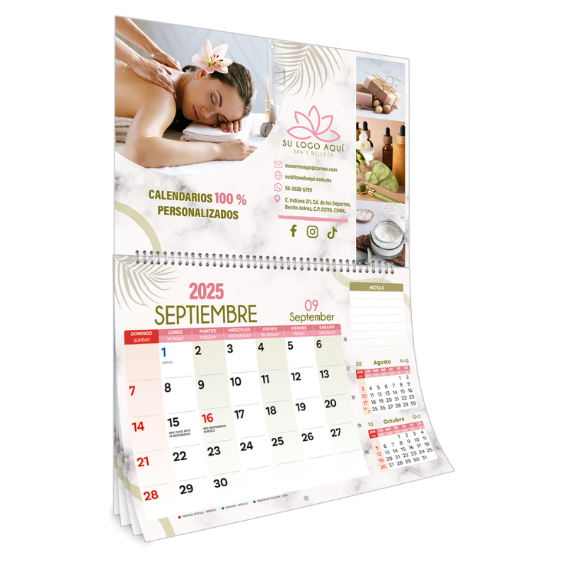 Calendario de pared organizador multihojas 12 hojas impresas en horizontal a todo color frente y vuelta con arillos metálicos y ojillo para colgar.