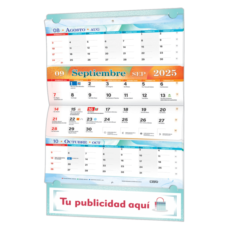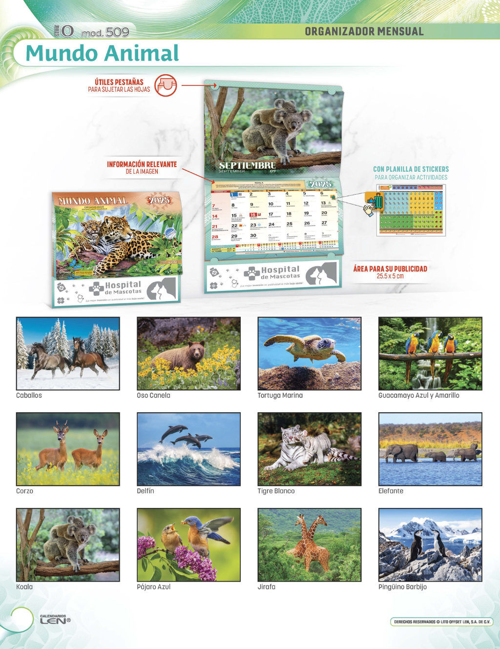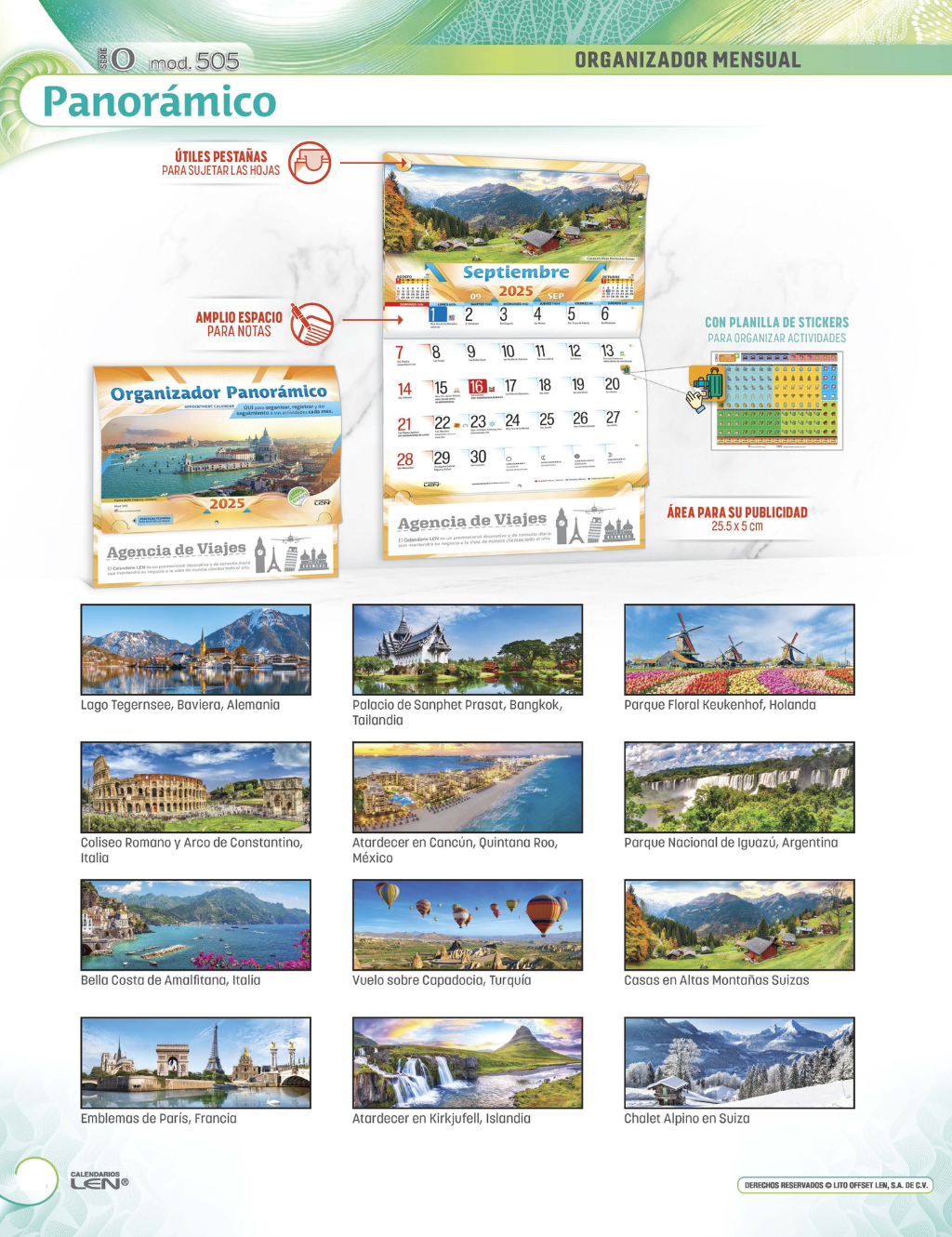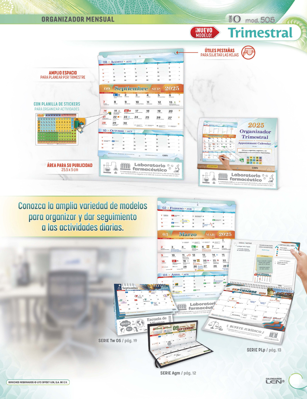 Calendario organizador de pared, portada en cartulina con barniz de alto brillo, interiores 12 hojas de papel satinado impreso a todo color (frente y vuelta), prácticas pestañas para sujetar las hojas y ojillo para colgar. Incluye: Planilla de stickers.