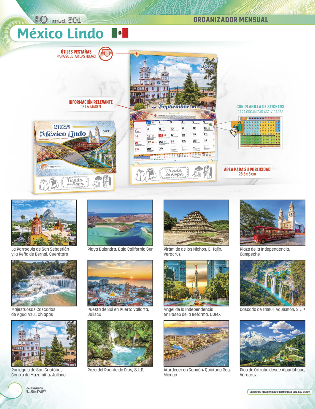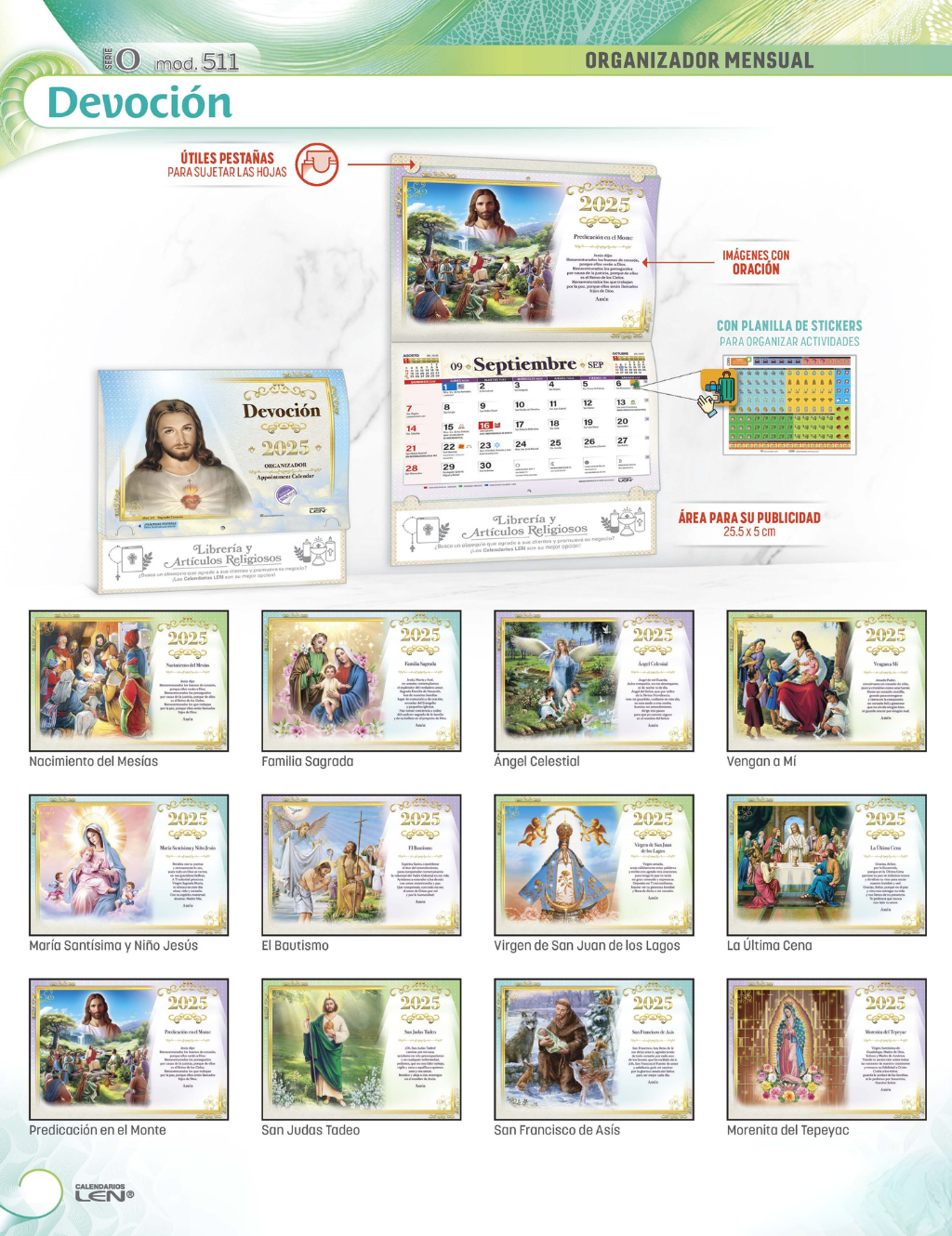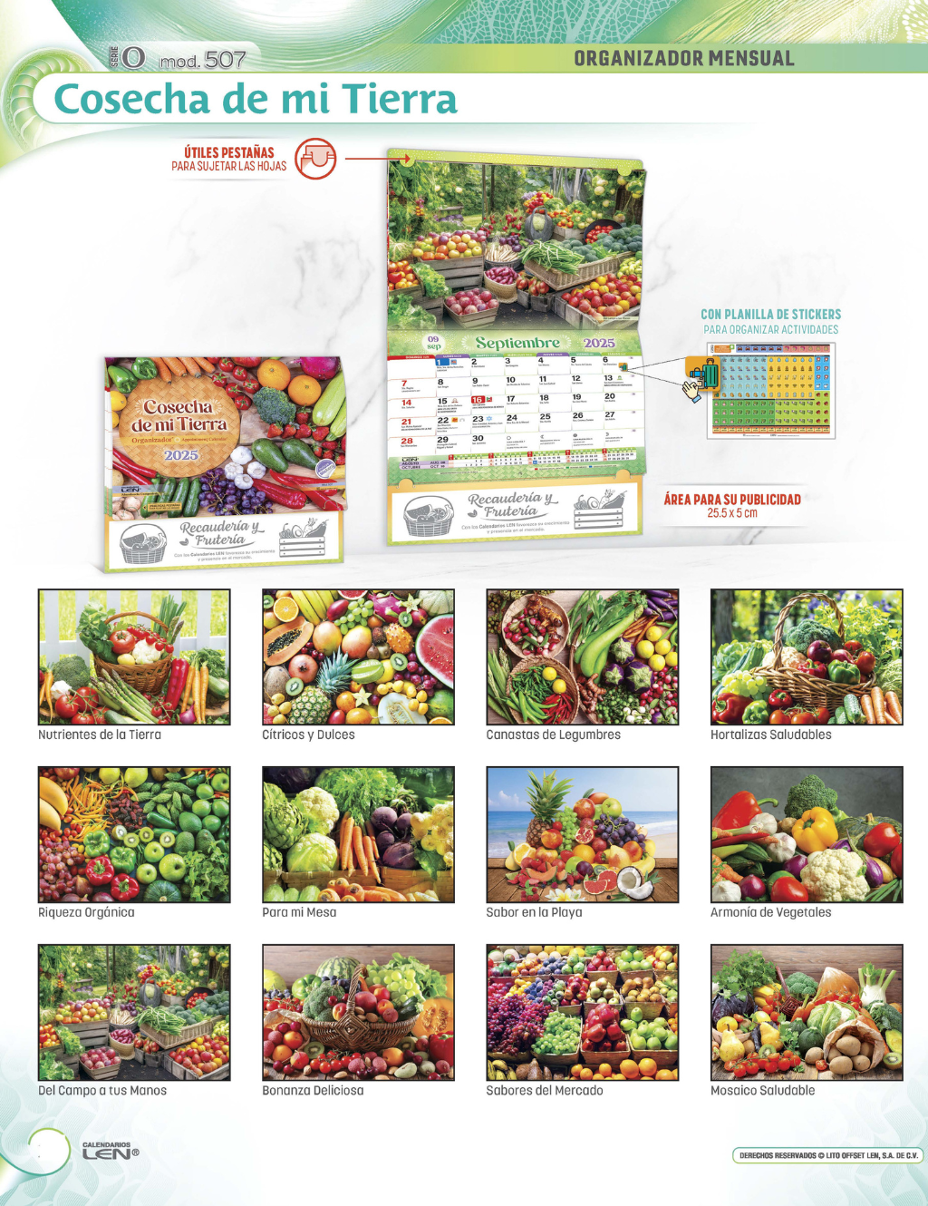 Calendario organizador de pared, portada en cartulina con barniz de alto brillo, interiores 12 hojas de papel satinado impreso a todo color (frente y vuelta), prácticas pestañas para sujetar las hojas y ojillo para colgar. Incluye: Planilla de stickers.