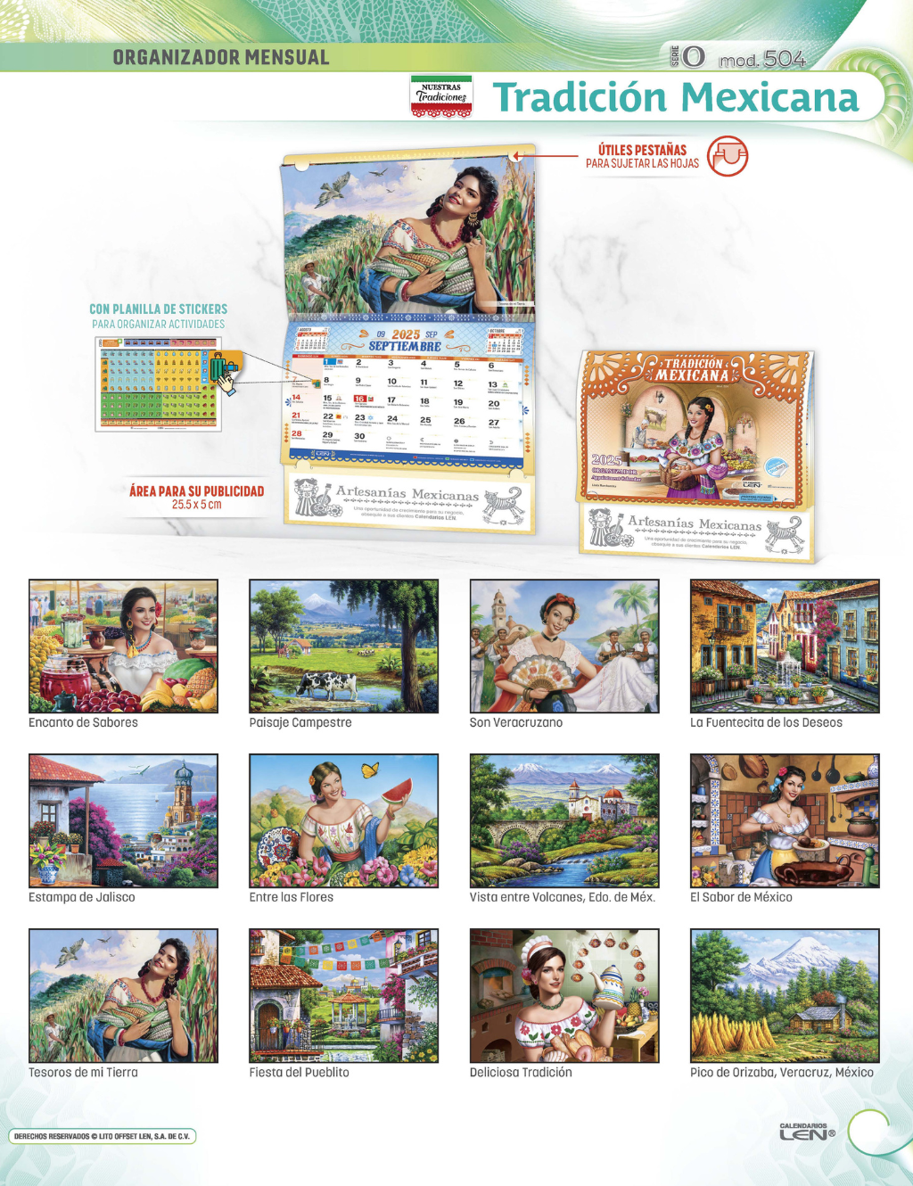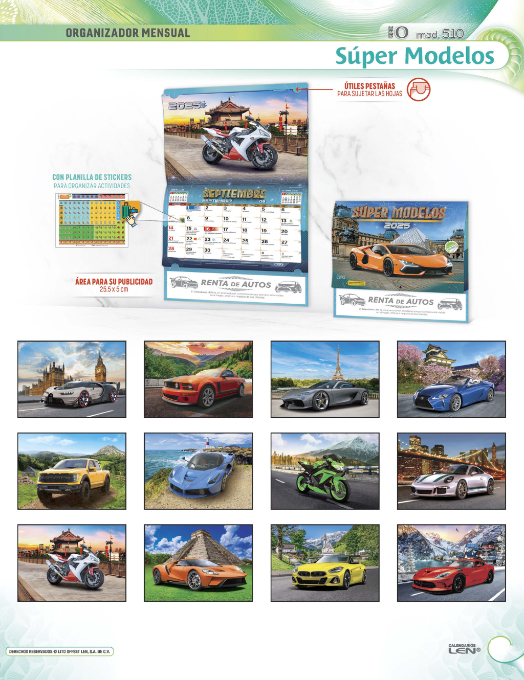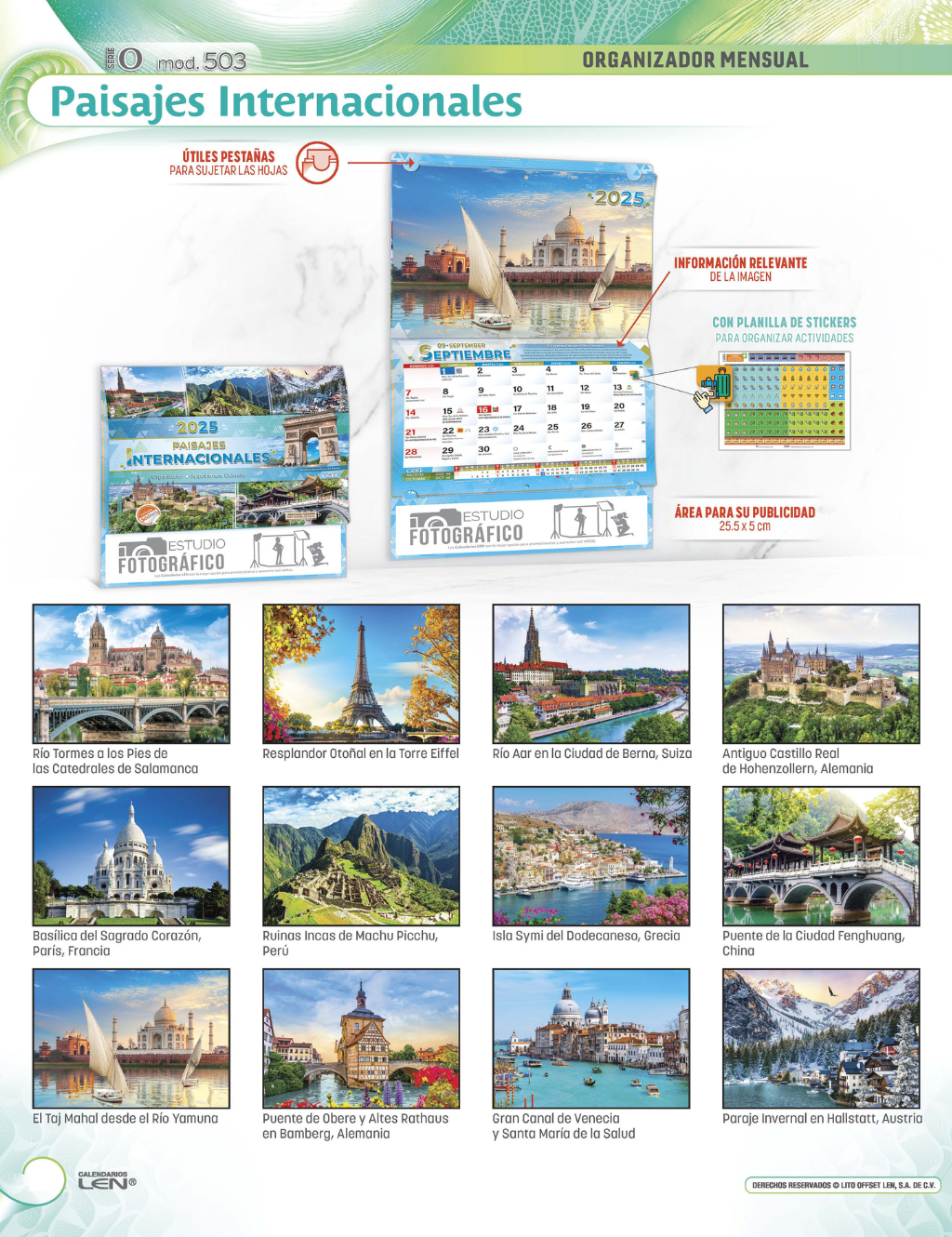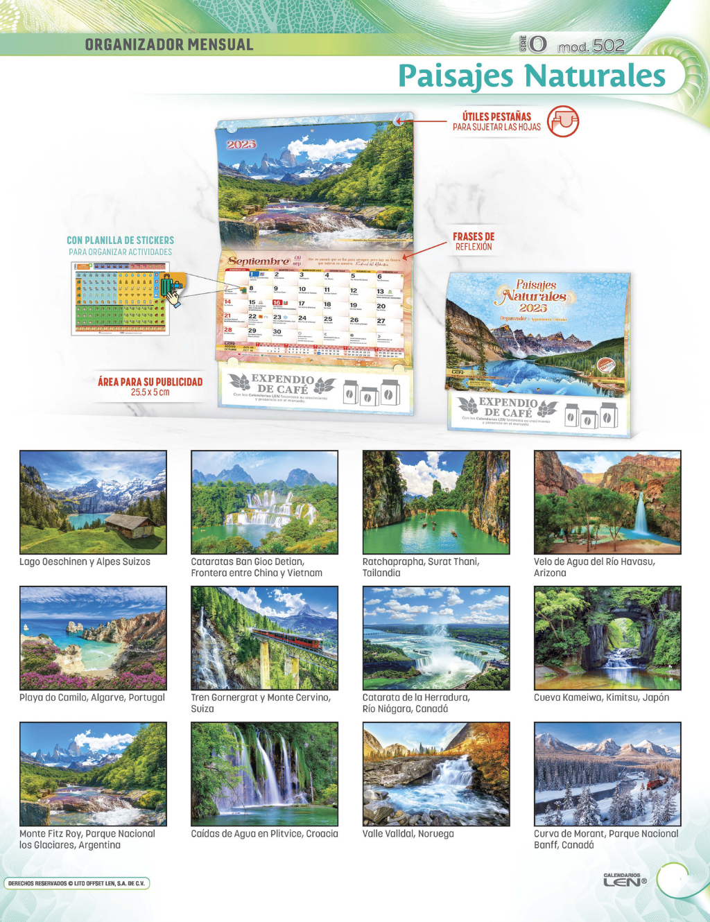 Calendario organizador de pared, portada en cartulina con barniz de alto brillo, interiores 12 hojas de papel satinado impreso a todo color (frente y vuelta), prácticas pestañas para sujetar las hojas y ojillo para colgar. Incluye: Planilla de stickers.