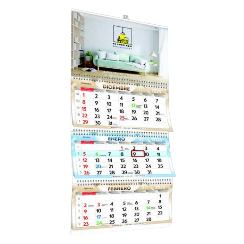 Calendario trimestral de cartulina, impreso a todo color con varilla para colgar, contiene 3 calendarios de 12 hojas cada uno, armado con arillos metálicos, con el mes en curso, el anterior y el siguiente. Accesorios: Colgador, indicador de fecha ajustable.