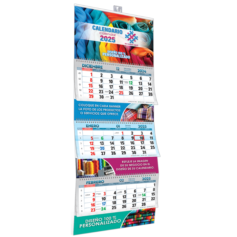 Calendario trimestral de cartulina, impreso a todo color con varilla para colgar, contiene 3 calendarios de 12 hojas cada uno, con el mes en curso, el anterior y el siguiente. Accesorios: Colgador, indicador de fecha ajustable.