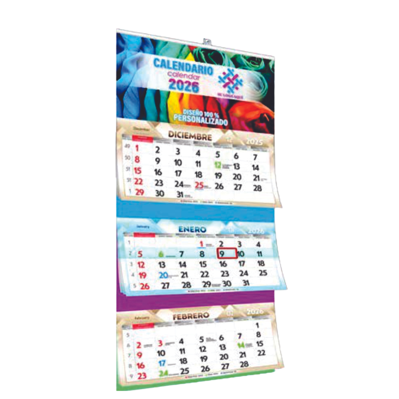 Calendario trimestral de cartulina, impreso a todo color con varilla para colgar, armado a grapa, contiene 3 calendarios de 12 hojas cada uno, con el mes en curso, el anterior y el siguiente. Accesorios: Colgador, indicador de fecha ajustable.